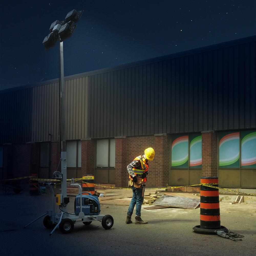 Hyundai 600W LED Light Tower with 51,000 lumens and 25,000SQFT coverage. Extendable to a height of 17 Feet. A low power consumption of only 600W means that a 2000W inverter generator can power this light tower with minimal fuel use, and power other tools in the vicinity at the same time.